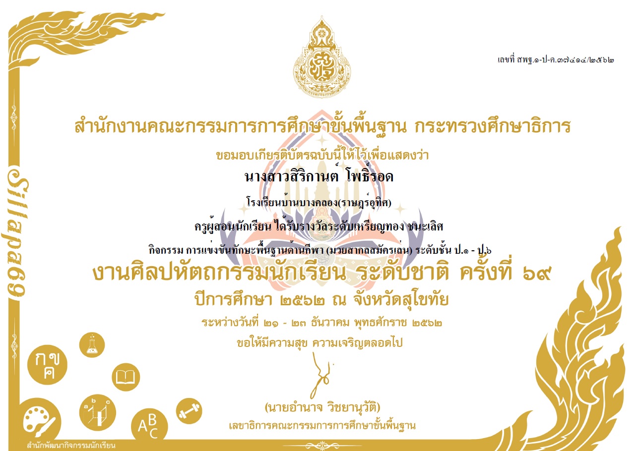 ชื่อผลงาน : รางวัลชนะเลิศ เหรียญทอง การแข่งขันงานศิลปหัตถกรรมนักเรียน ครั้งที่ 69 ระดับชาติ