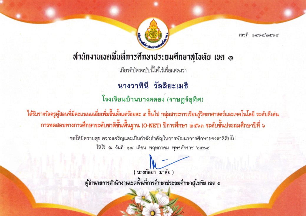 ชื่อผลงาน : รางวัลครูผู้สอนที่มีคะแนนเฉลี่ยเพิ่มขึ้นตั้งแต่ร้อยละ4ขึ้นไป วิทยาศาสตร์ ระดับดีเด่น