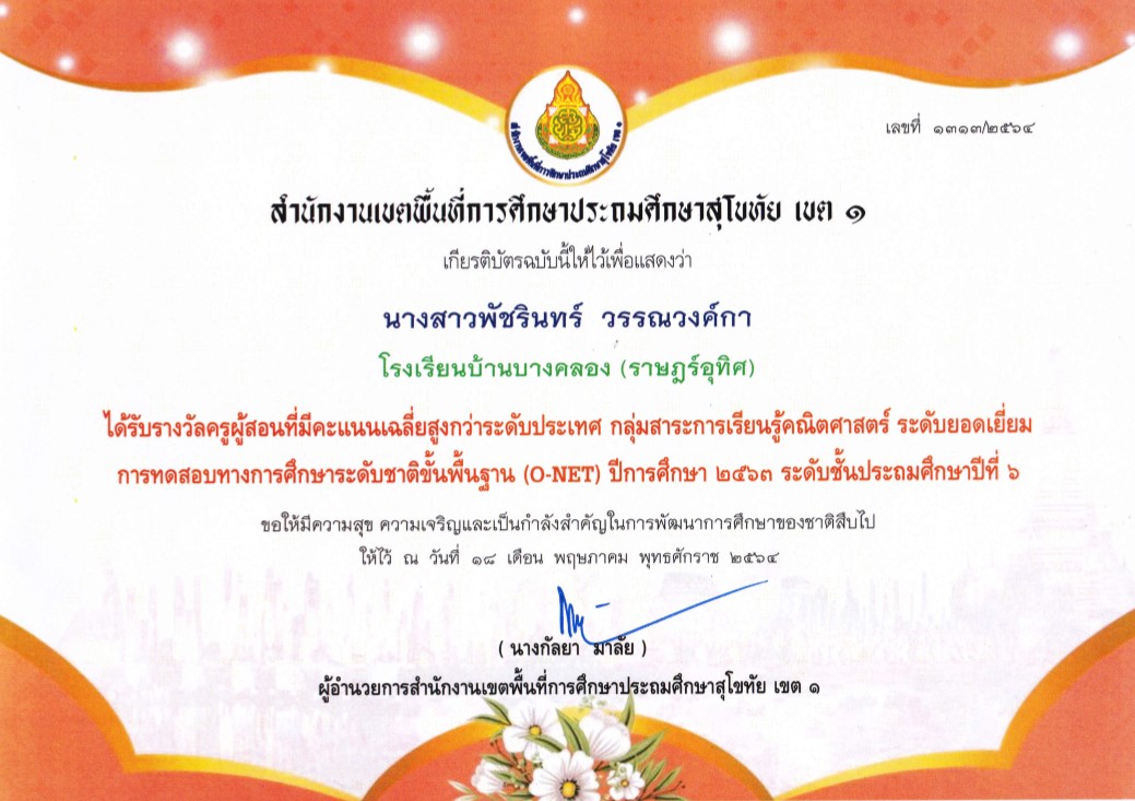 ชื่อผลงาน : รางวัลครูผู้สอนที่มีคะแนนเฉลี่ยสูงกว่าระดับประเทศ คณิตศาสตร์ ระดับยอดเยี่ยม
