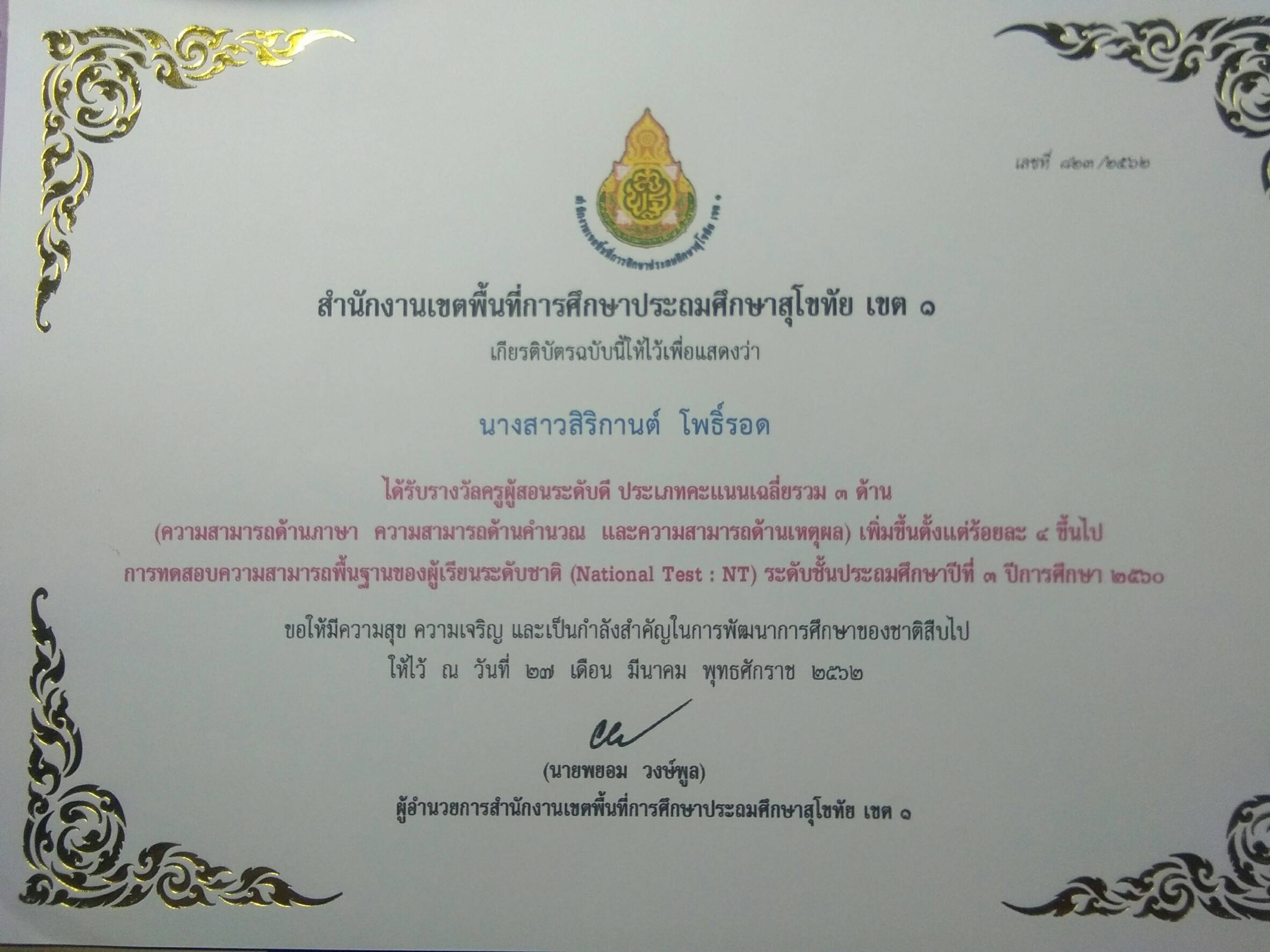 ชื่อผลงาน : รางวัลครูผู้สอนระดับดี
