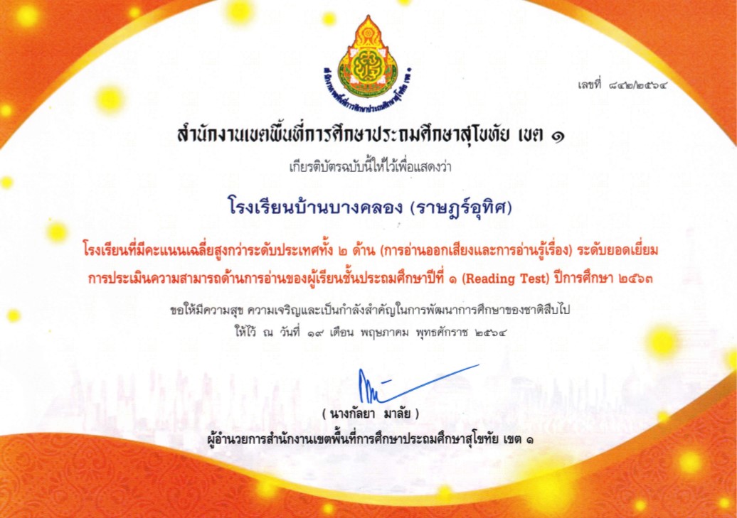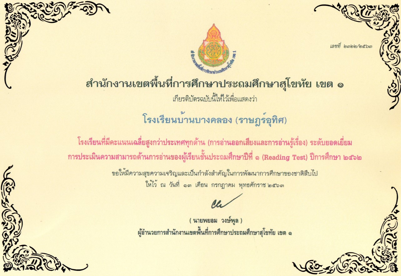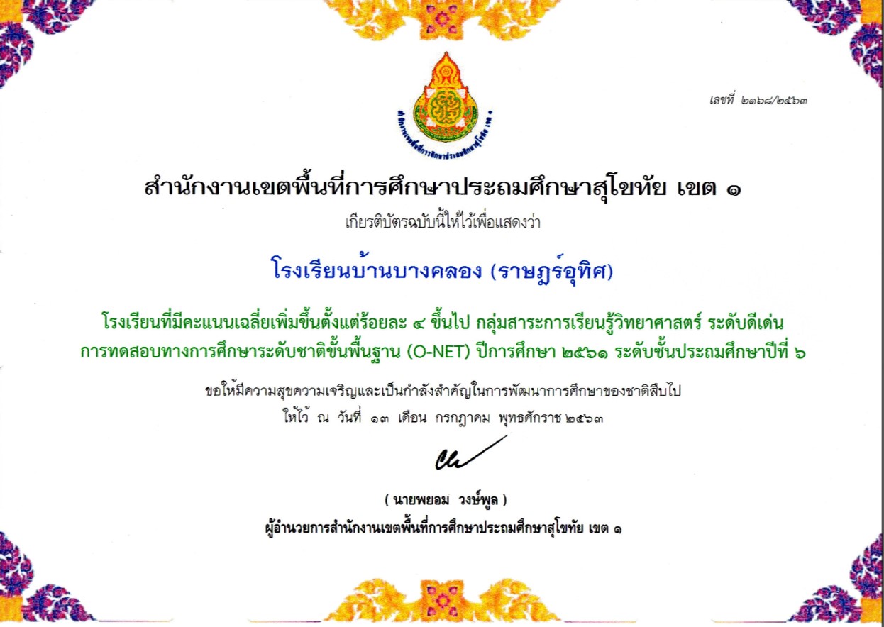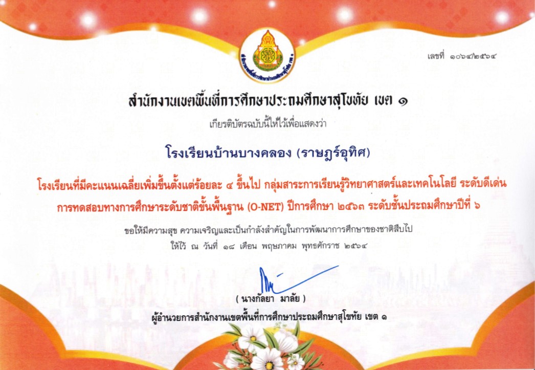รางวัลโรงเรียน O-NETวิชาภาษาไทย เพิ่มร้อยละ4 ระดับดีเด่น